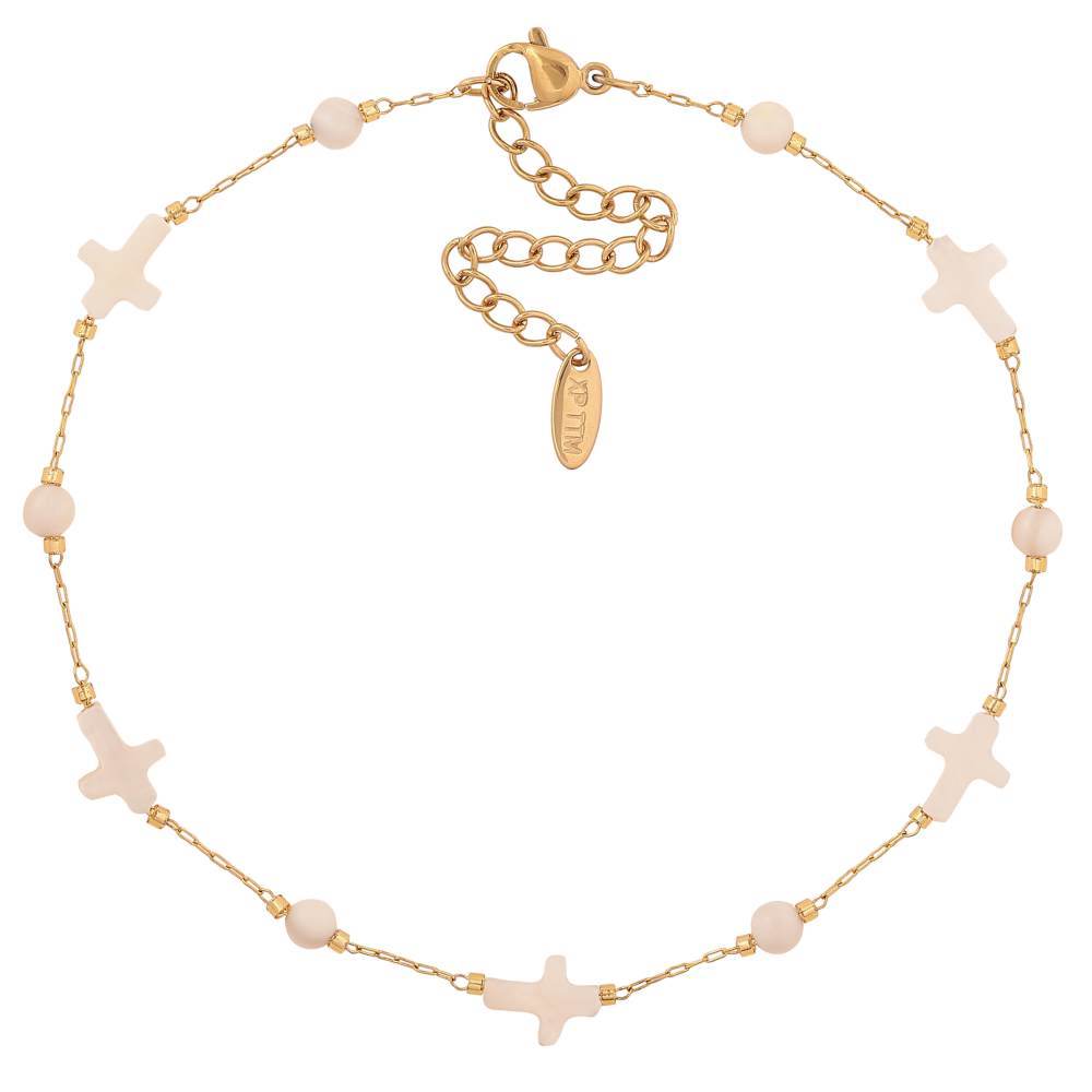 Браслет Xuping ТТМ Stainless Steel колір 14К на ногу "Ланцюжок з перламутровими хрестиками і намистинами" довжина з доп. ланцюжком 24.5-30см х 1-8мм