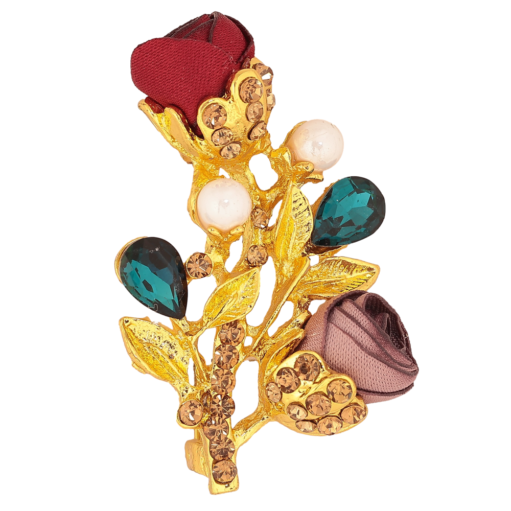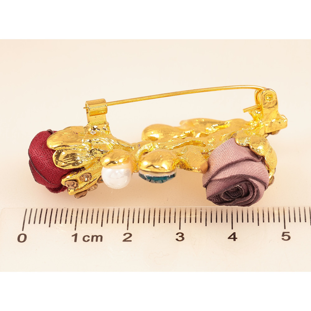 Брошка "Гілочка з червоно-бежевими квіточками, стразами та перлинами"
