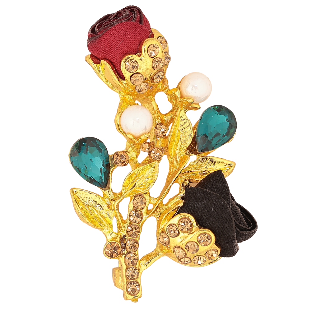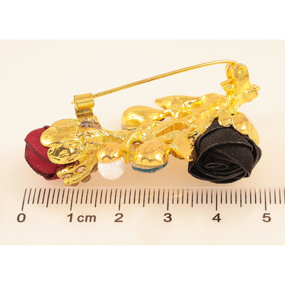 Брошка "Гілочка з червоно-чорними квіточками, стразами та перлинами"