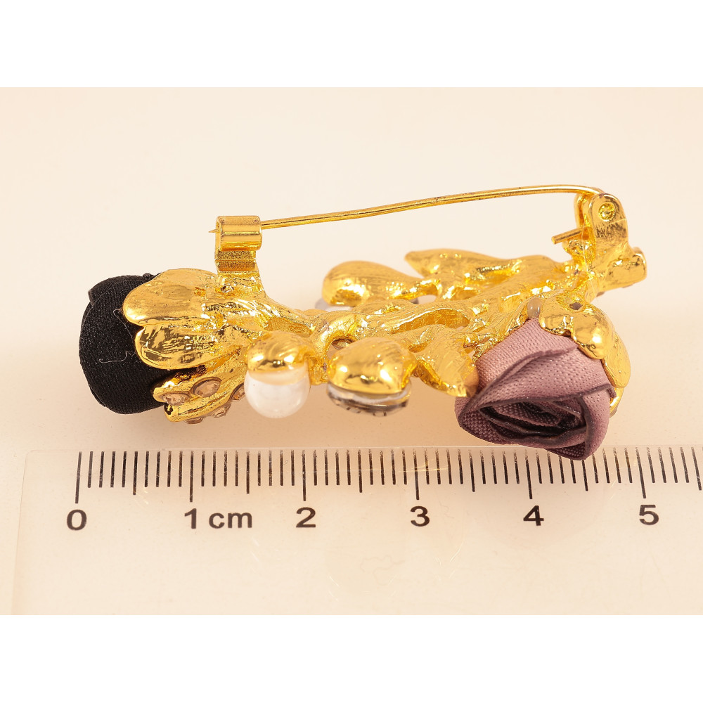 Брошка "Гілочка з чорно-бежевими квіточками, стразами та перлинами"