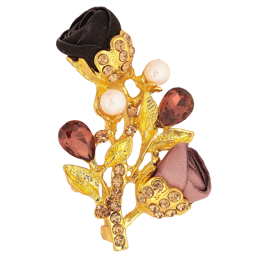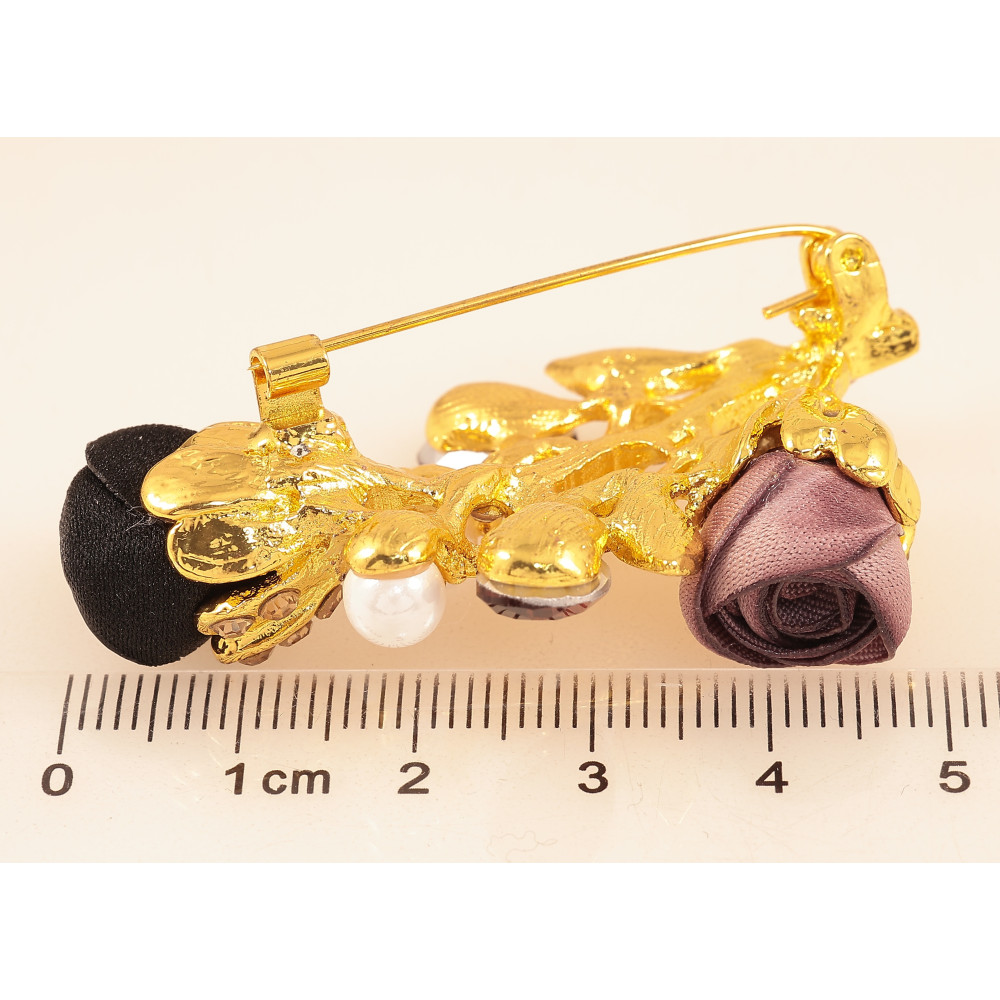 Брошка "Гілочка з чорно-бежевими квіточками, стразами та перлинами"
