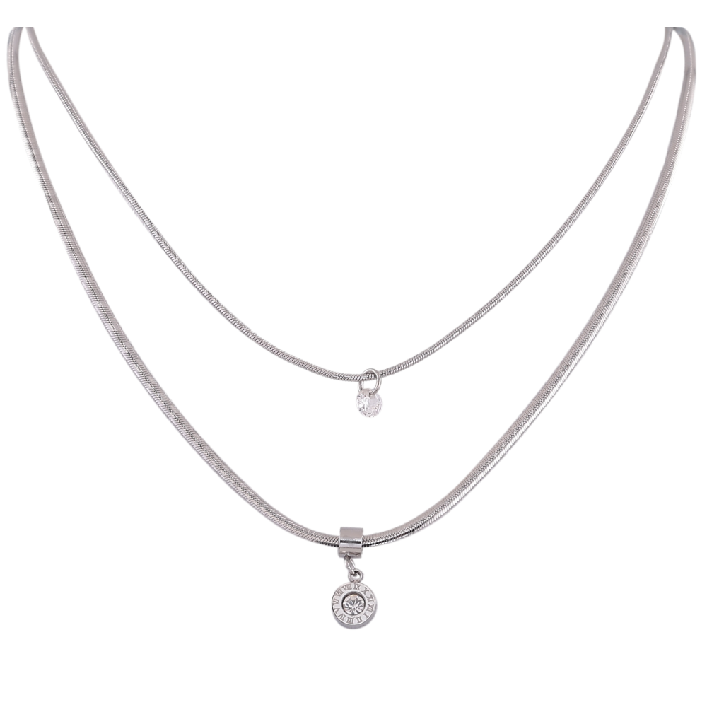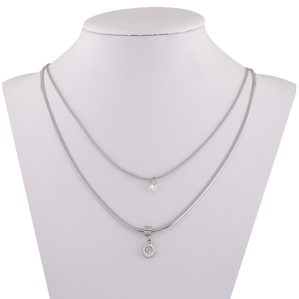 Кольє Xuping ТТМ Stainless Steel колір Родій "Подвійний ланцюжок з циферблатом і кристалами" довжина 41-46см х 1-2мм