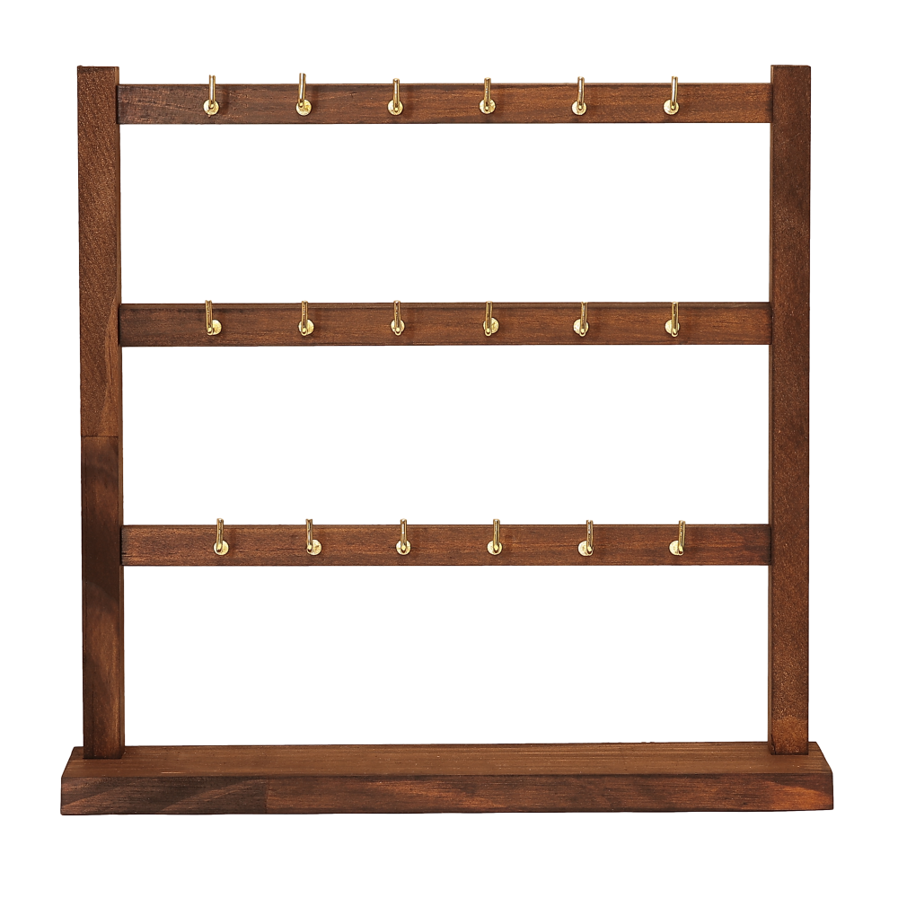 Демонстраційна підставка з дерева із золотистими металевими гачками, для продажу або домашнього зберігання біжутерії та ювелірних виробів. Відправляється стійка у розібраному вигляді. Збирається легко, без використання додаткових інструментів, так як у ній вже є всі пази та отвори, гачки вкручуються.