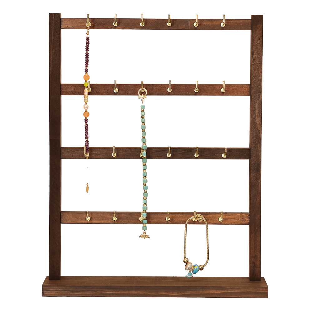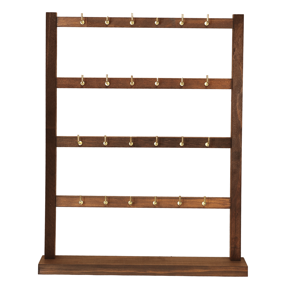 Демонстраційна підставка з дерева із золотистими металевими гачками, для продажу або домашнього зберігання біжутерії та ювелірних виробів. Відправляється стійка у розібраному вигляді. Збирається легко, без використання додаткових інструментів, так як у ній вже є всі пази та отвори, гачки вкручуються.