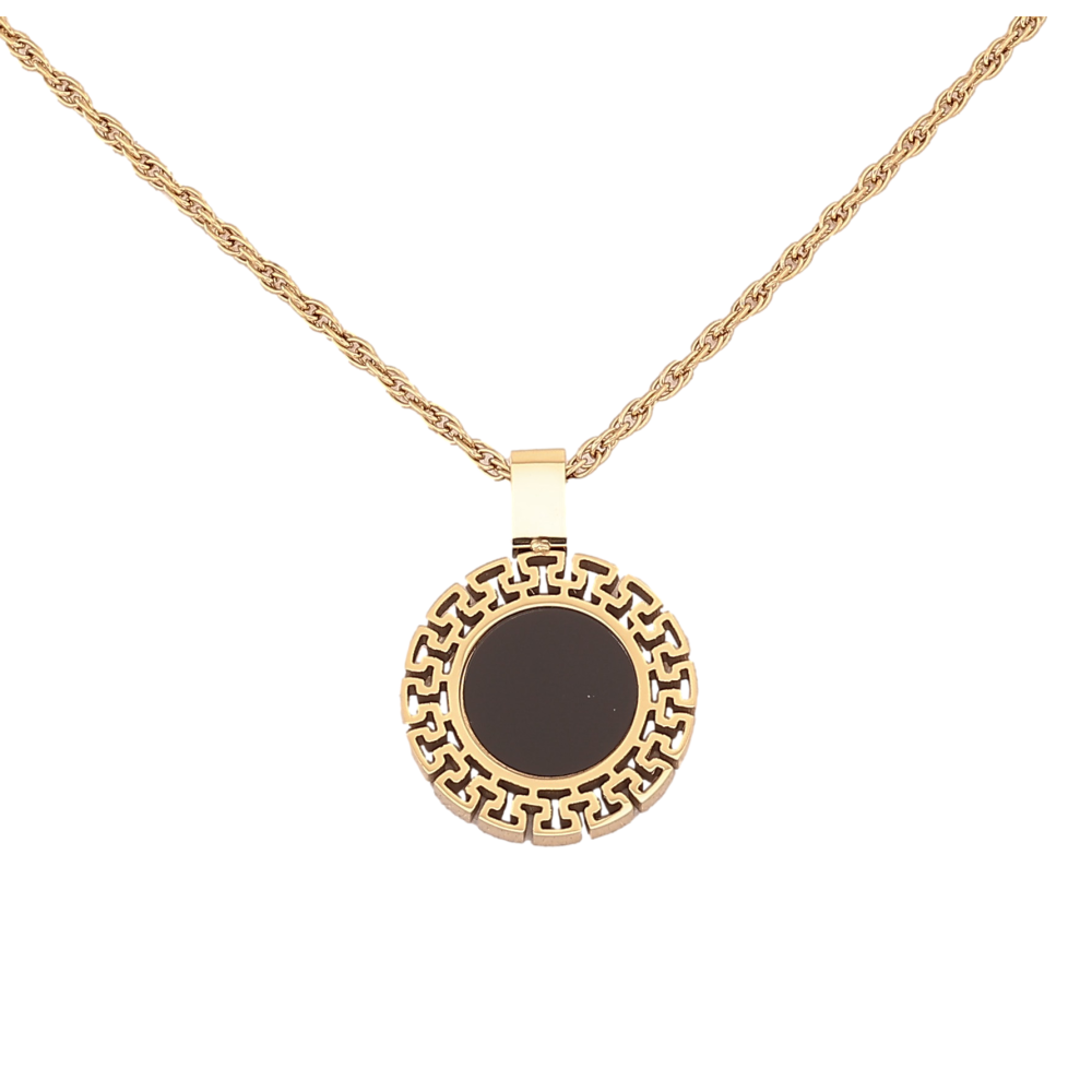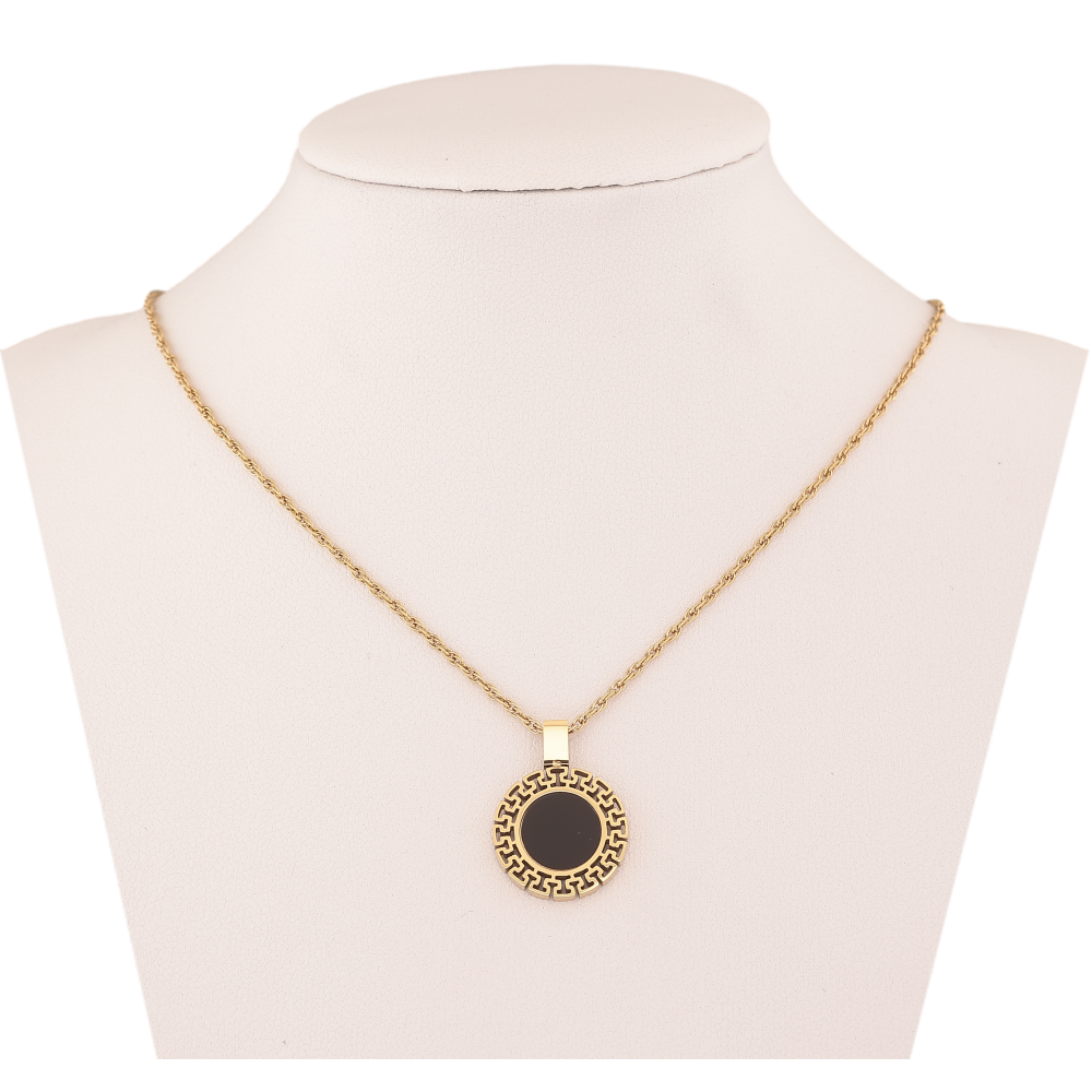 Підвіска на ланцюжку Xuping ТТМ Stainless Steel колір 14К "Коло з різьбленим візерунком та чорною вставкою" довжина 45-50см х 1.5мм