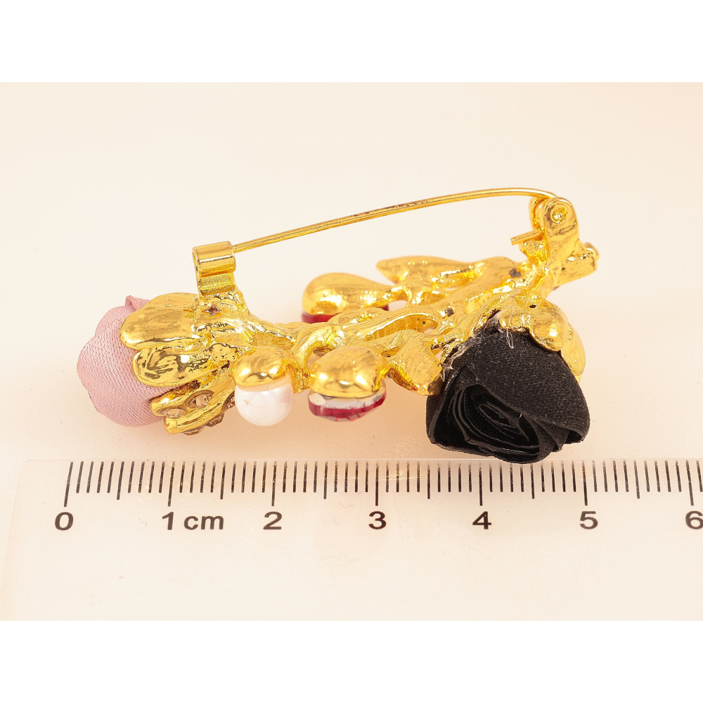 Брошь "Веточка с розово-черными цветочками, стразами и жемчужинами"