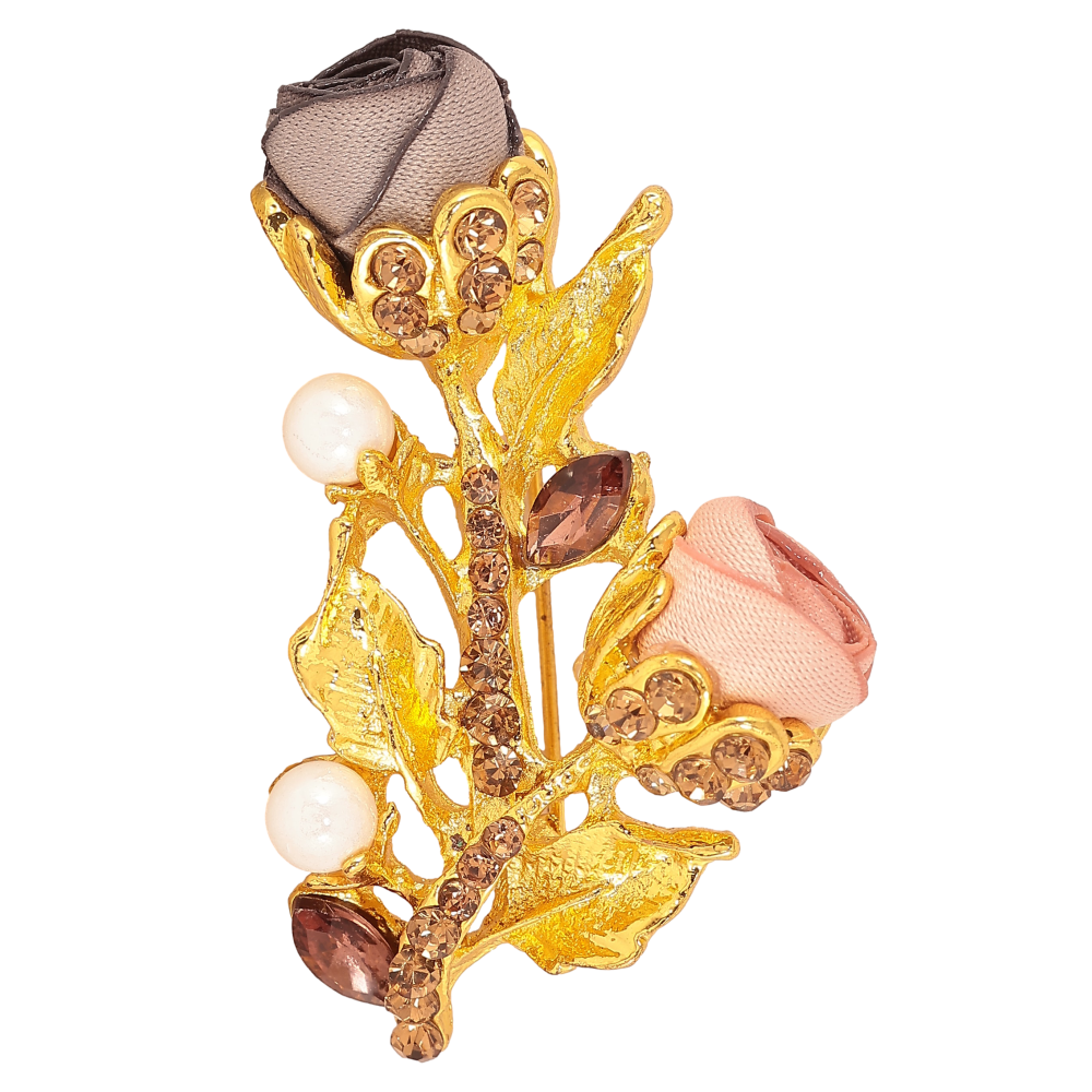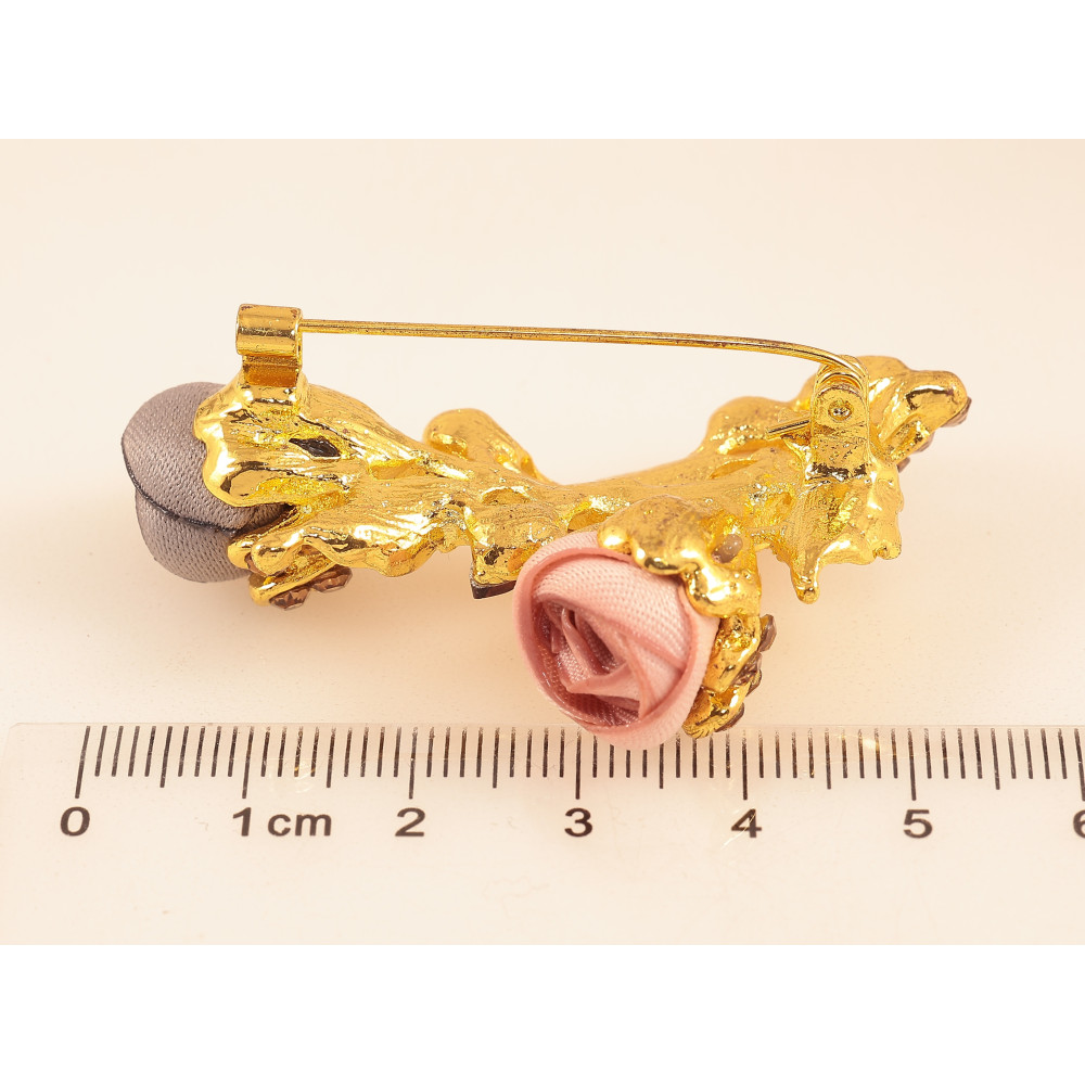 Брошь "Веточка с розово-серыми цветочками, стразами и жемчужинами"
