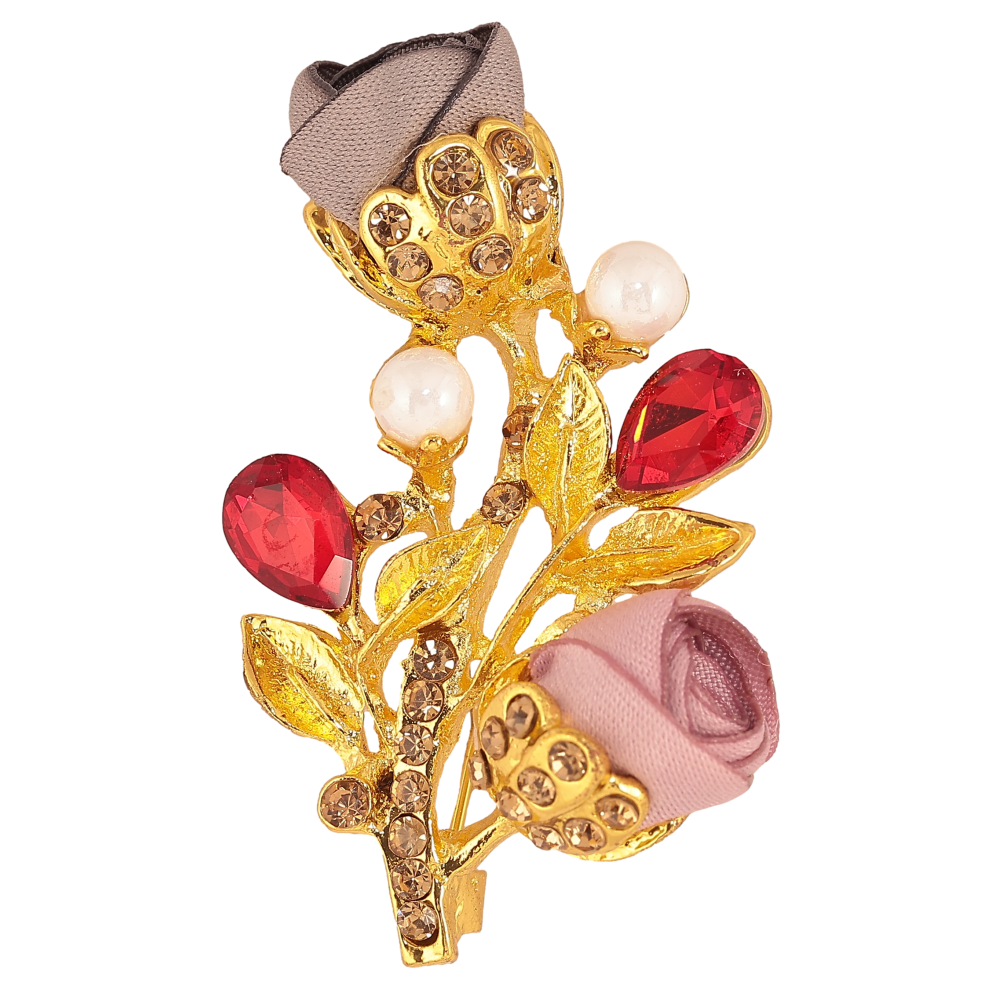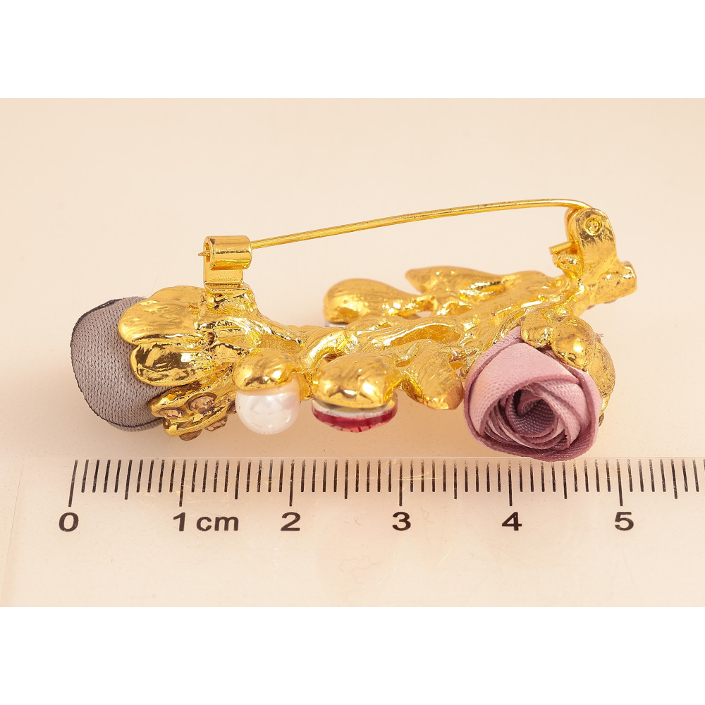 Брошь "Веточка с розово-серыми цветочками, стразами и жемчужинами"