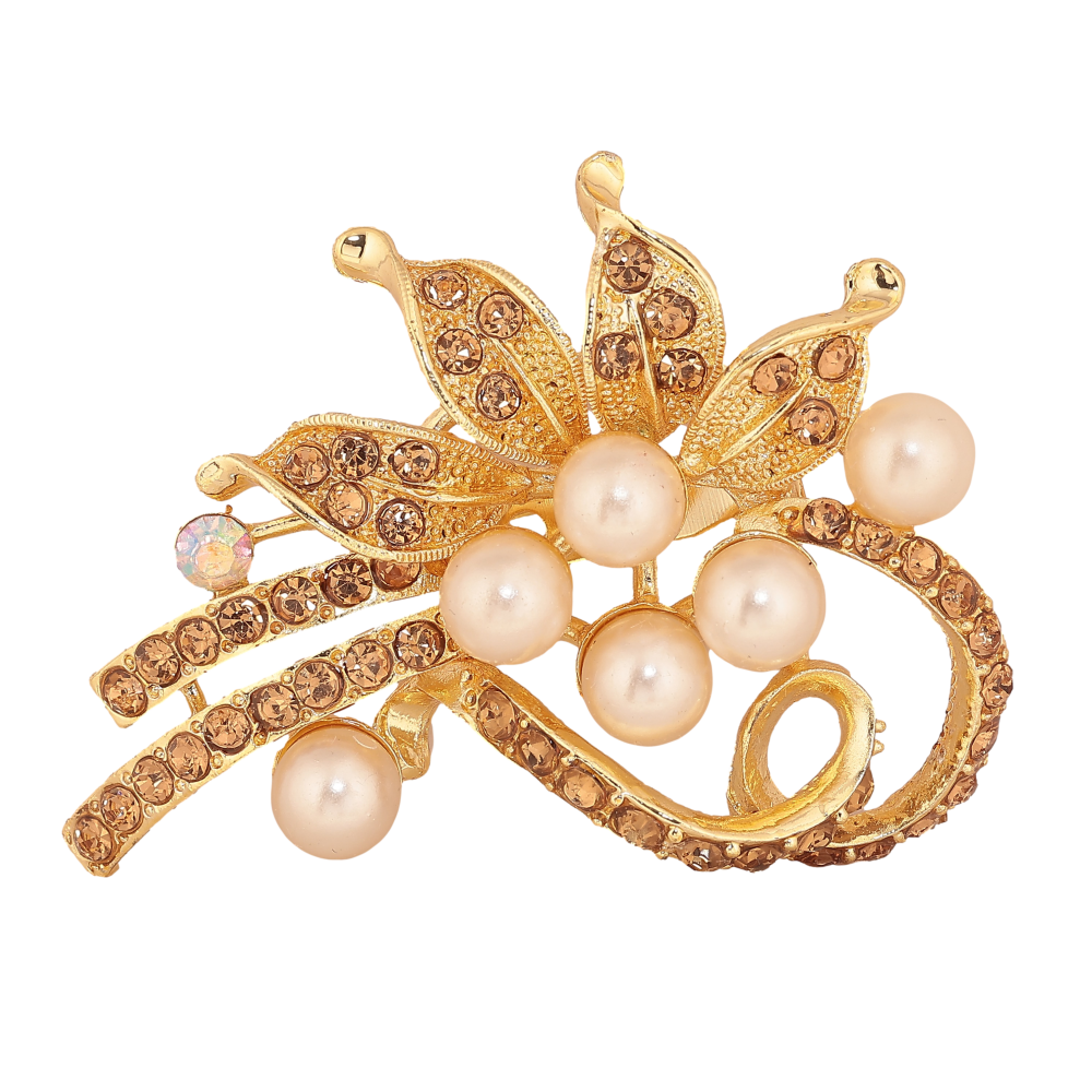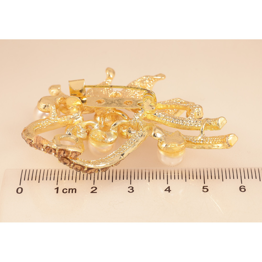 Брошь "Цветочная композиция с золотистыми стразами и жемчужинами"
