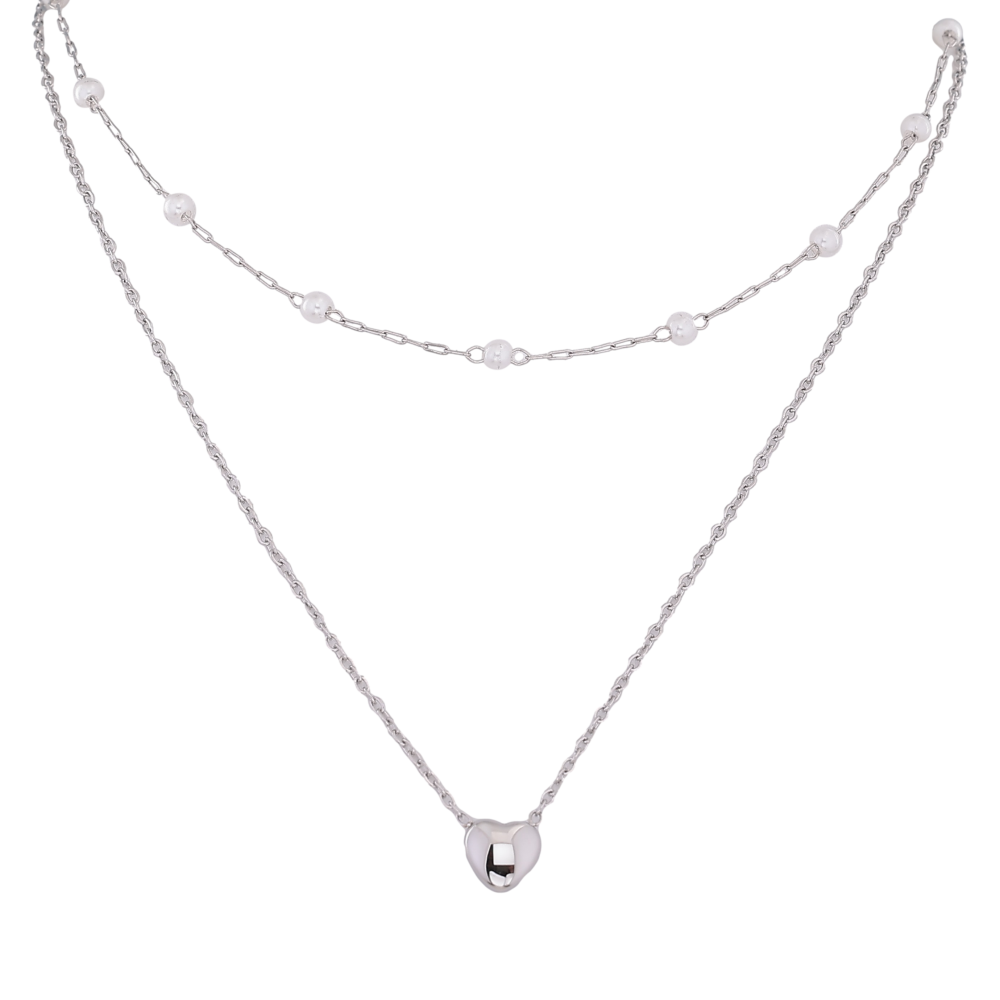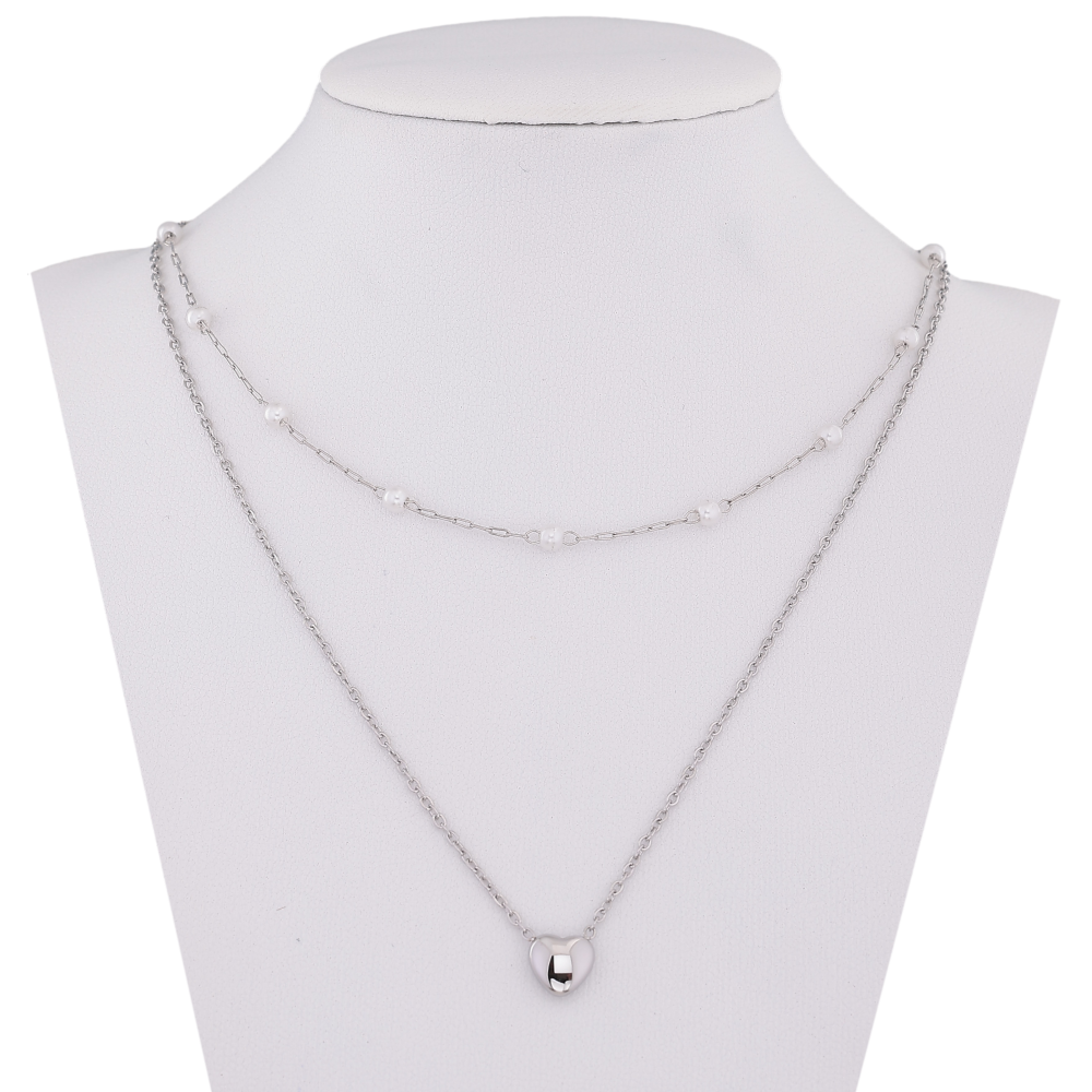 Колье Xuping ТТМ Stainless Steel цвет Родий "Двойная цепочка с жемчужными бусинами и сердечком" длинна 41-46см х 1-4мм