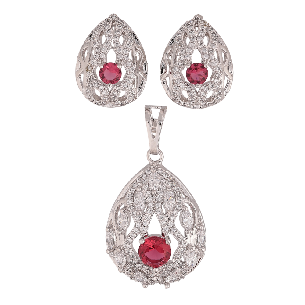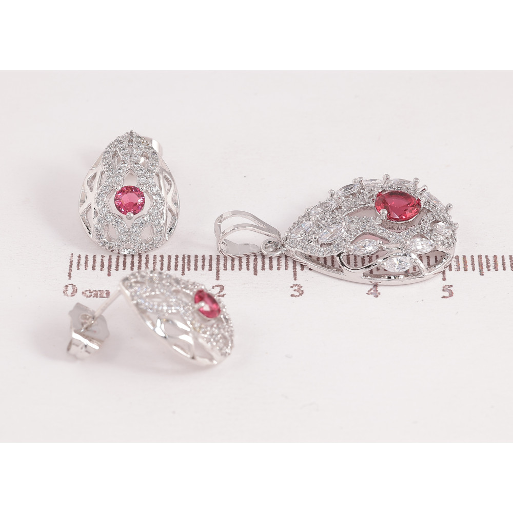 Набор Xuping цвет Родий Серьги Кулон "Ажурная капля с красными кристаллами"