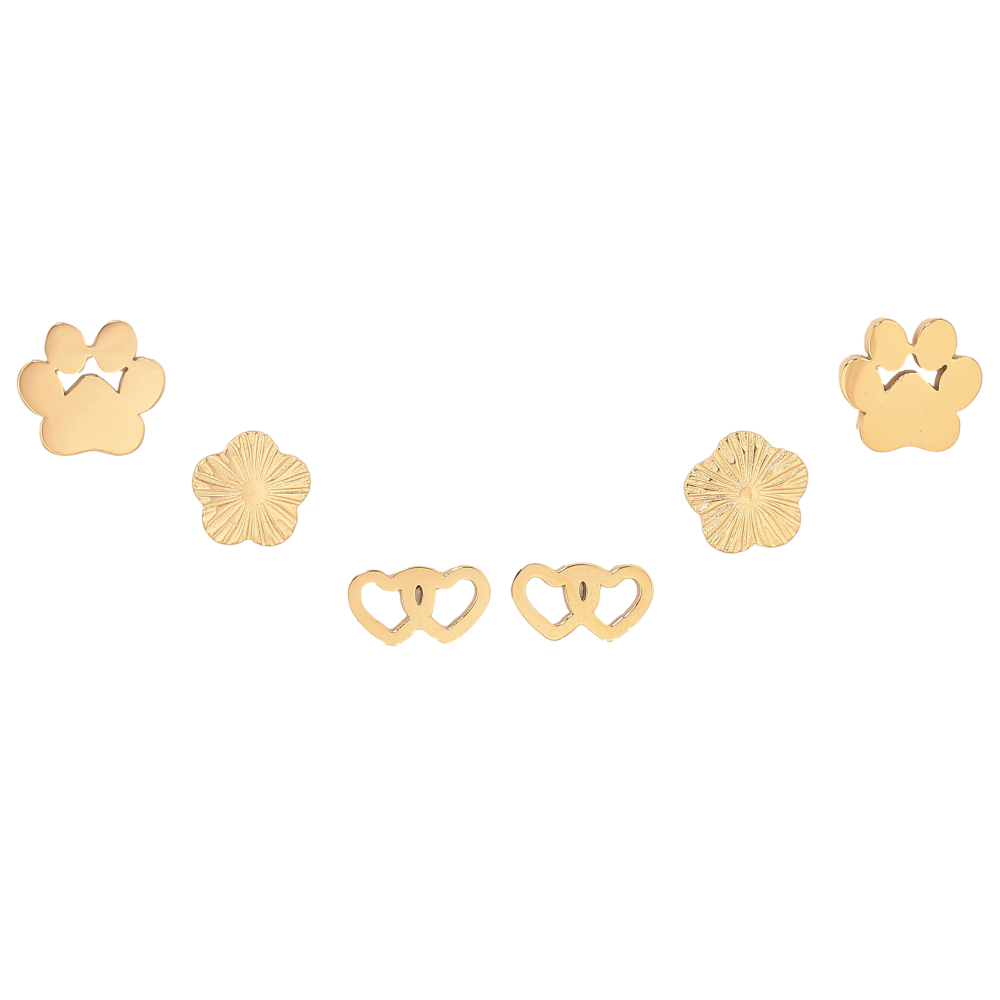 Серьги Набор (3 пары) Xuping TTM Stainless Steel цвет 14К пусеты "Лапки, цветочки и сердечки"