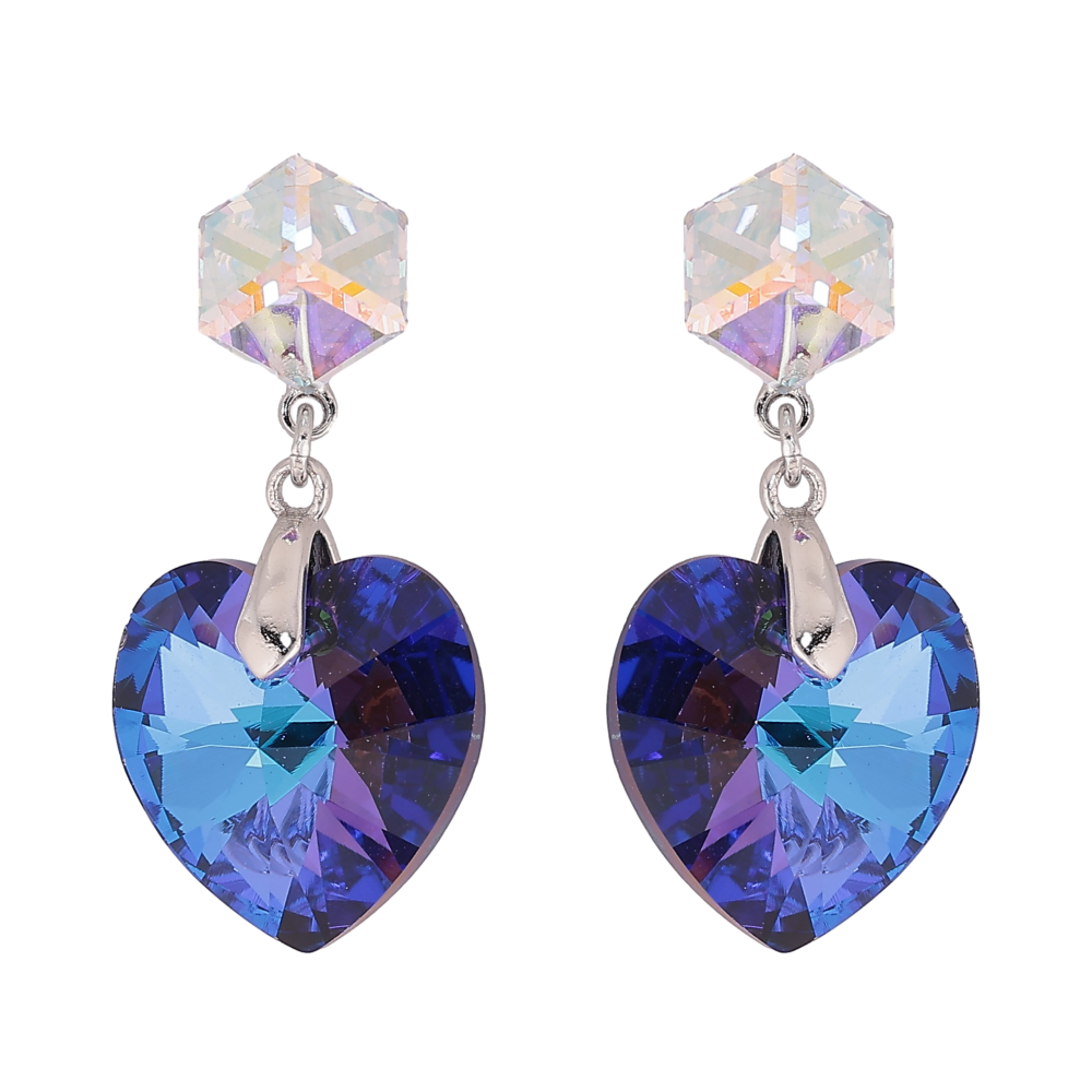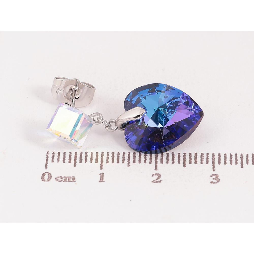 Серьги Xuping цвет Родий с кристаллами Swarovski пусеты "Кубики с кр-ми сердечками Bermuda Blue"