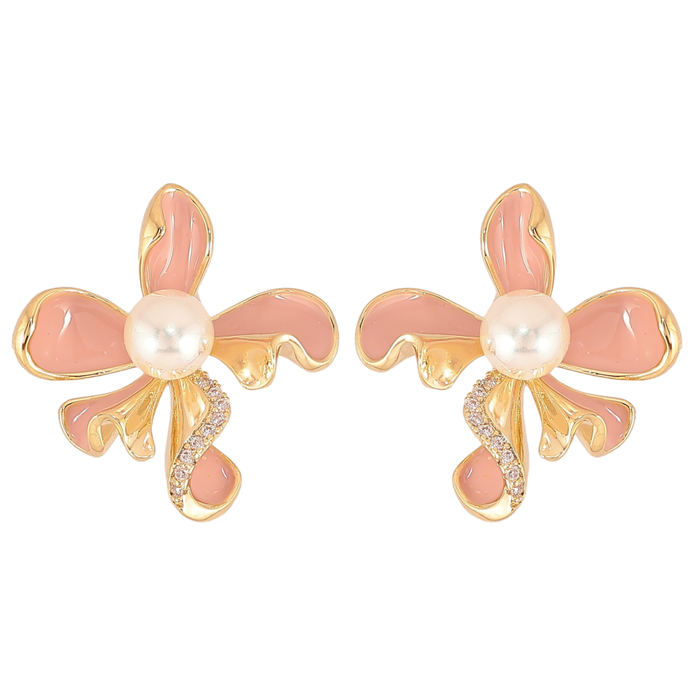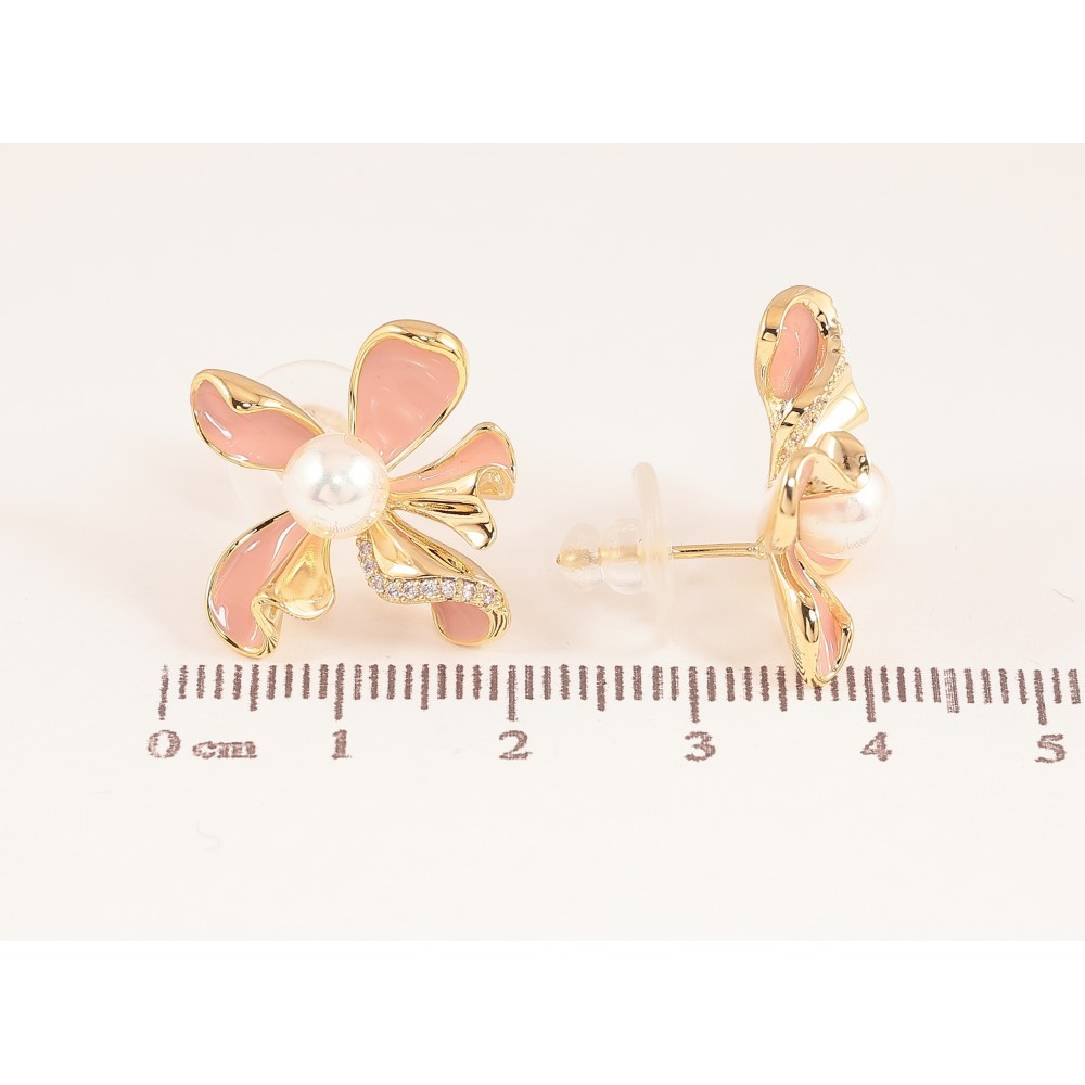 Серьги Xuping QQMM цвет Позолота 14K пусеты "Декоративные цветочки с бежевой эмалью и жемчужинами"