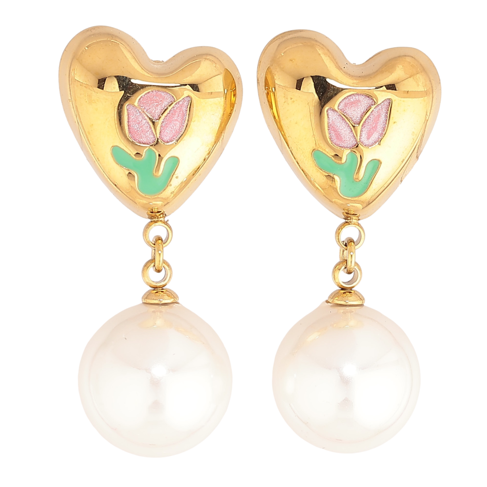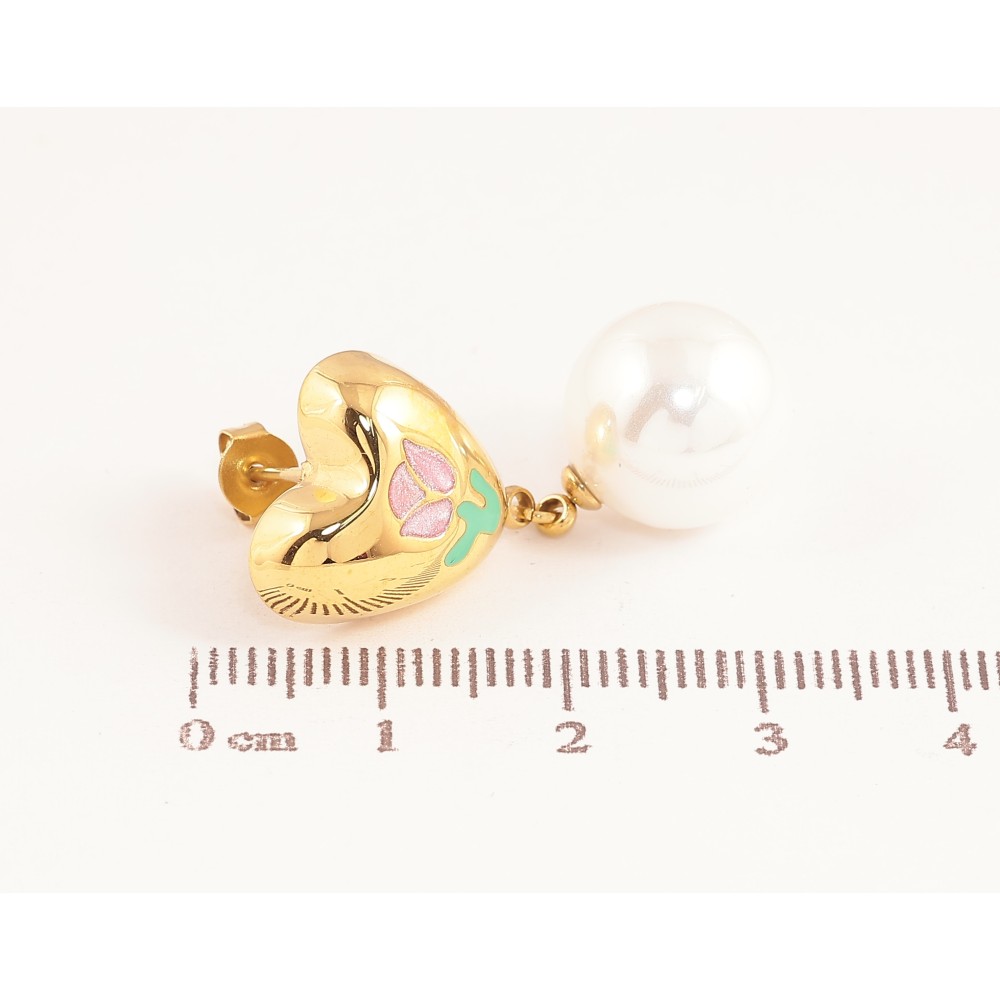 Сережки Нержавіюча сталь пусети "Сердечки з візерунком квіточки та перлинними підвісками"